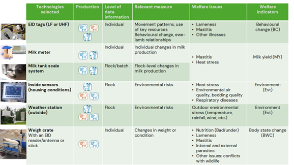 Given the priorities regarding issues and technologies, the consortium selected a list of technologies to test in experimental farms and pilot farms of partner organizations, and ultimately on commercial farms. The table below presents, for each of the technologies listed in the row, the category of the welfare indicator for which it can be used and the indicators to evaluate it.
